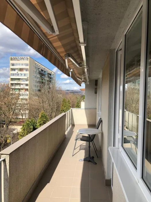 Apartamentul este compartimentat astfel:bucatarie, living, 2 dormitoare, baie, hol si un balcon de 10 mp care dispune de o copertina retractabila.
