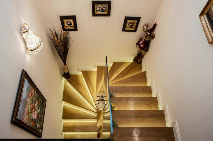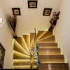 -la parter sunt 1 living cu semineu electric, 1 bucatarie complet mobilata si utilata, delimitata cu un paravan de sticla, zona pentru servirea mesei, 1 dressing extrem de spatios, 1 baie, 1 hol, si 1 balcon de 15 mp..Bucataria de la parter dispune de electrocasnice din gama PREMIUM.