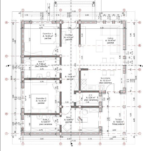 -compartimentarea casei este urmatoarea: 1 living open space cu bucataria si zona pentru servirea mesei, 2 dormitoare, 2 bai, 1 birou, 1 vestibul, 1 hol, 1 camera tehnica, si o terasa.